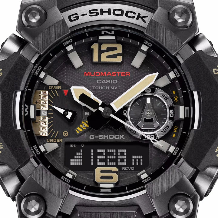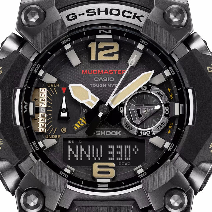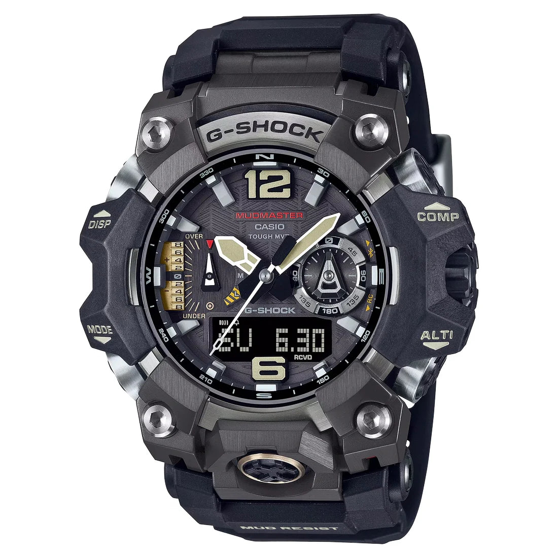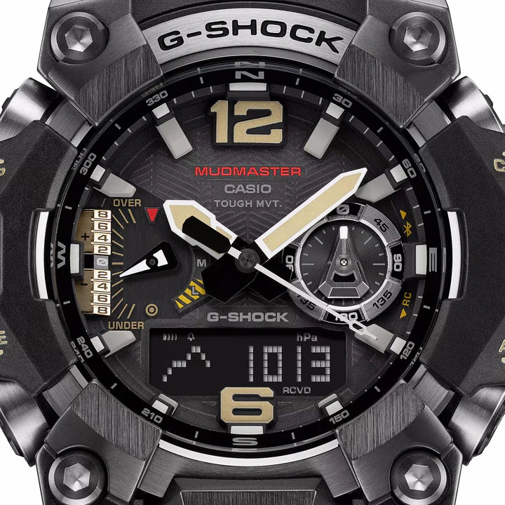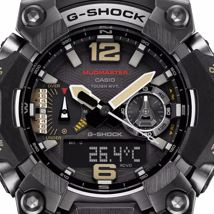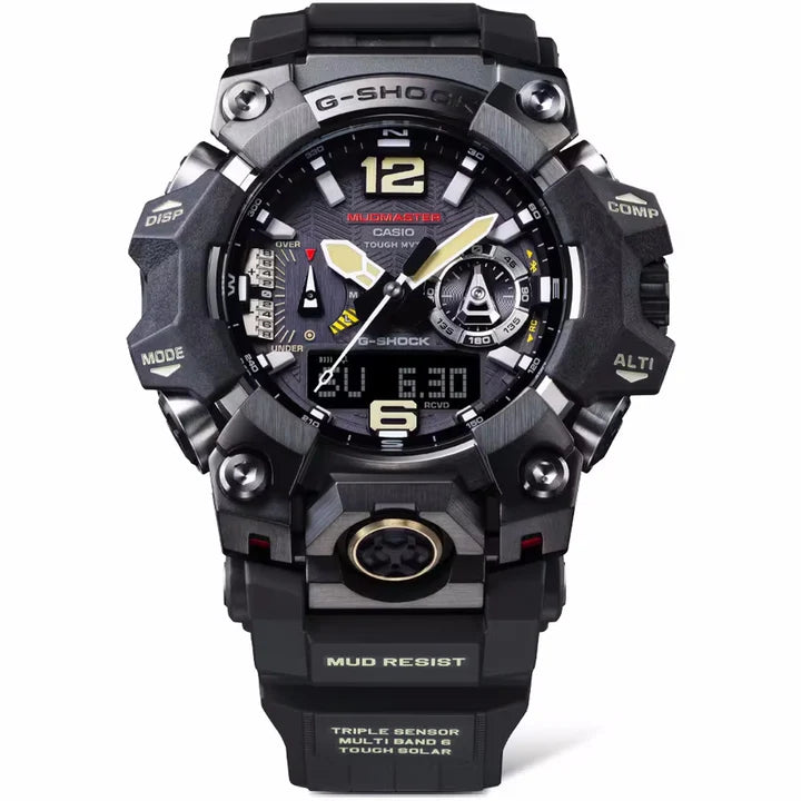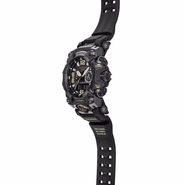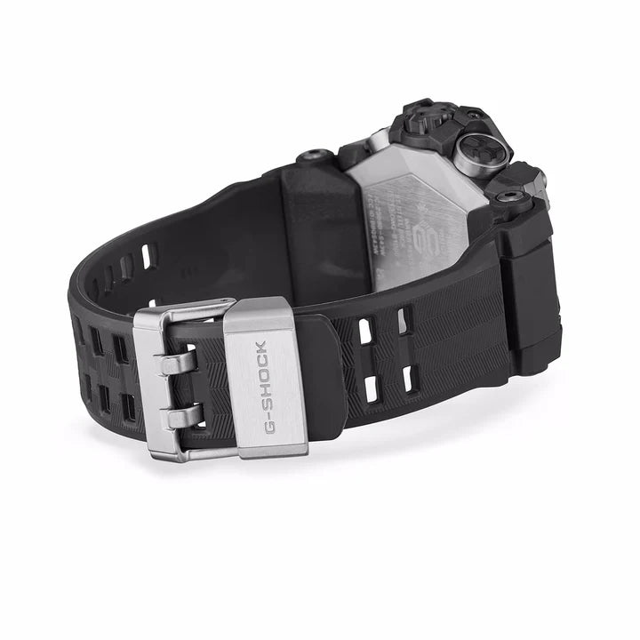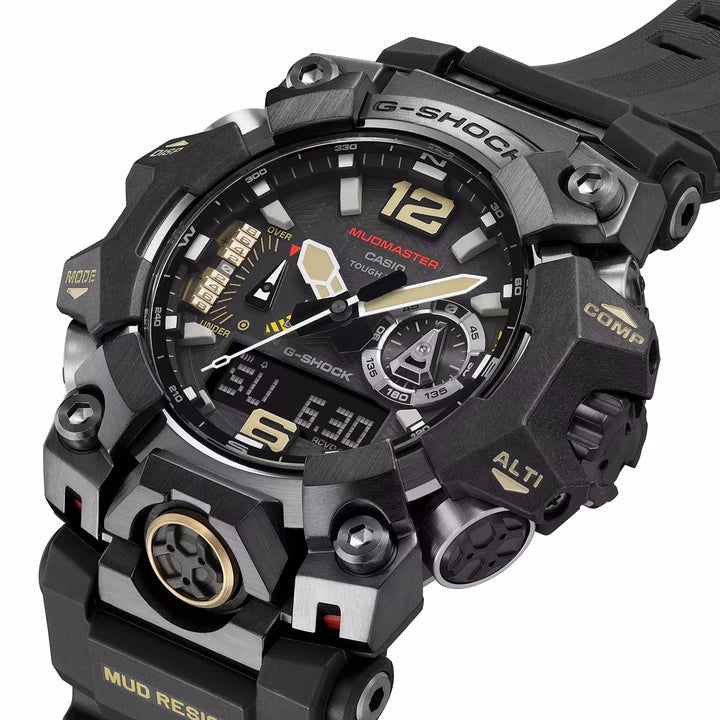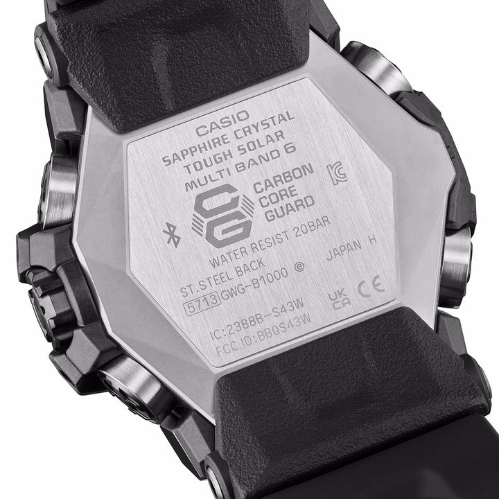Vivi avventure estreme con GWG-B1000 della serie G-SHOCK Mudmaster. Progettato per resistere anche nelle situazioni più difficili, questo Master of G è particolarmente resistente agli urti, alla polvere e al fango grazie al sistema di guarnizioni e alla struttura di protezione completamente ridisegnata che integra componenti realizzati con materiali diversi: per l’esterno in metallo vengono utilizzate tecniche di forgiatura ad alta precisione, mentre la cassa si presenta in resina rinforzata con fibra di carbonio. L’orologio è dotato di un triplo sensore che fornisce dati su altitudine, pressione barometrica e temperatura per seguirti ovunque. E con l'indicatore di posizione seguirai sempre la direzione corretta, anche quando la visibilità è limitata. Completano le funzioni di questo modello la ricarica solare e il sistema di radiocontrollo e di connettività allo smartphone per una maggiore precisione e affidabilità. Le luci a doppio LED e il vetro zaffiro garantiscono poi un'elevata leggibilità, in modo da poter vedere sempre l'ora e gli altri dati in tutte le condizioni di luce. Per una maggiore attenzione verso l’ambiente, cassa, lunetta e cinturino sono realizzati in resine a base biologica