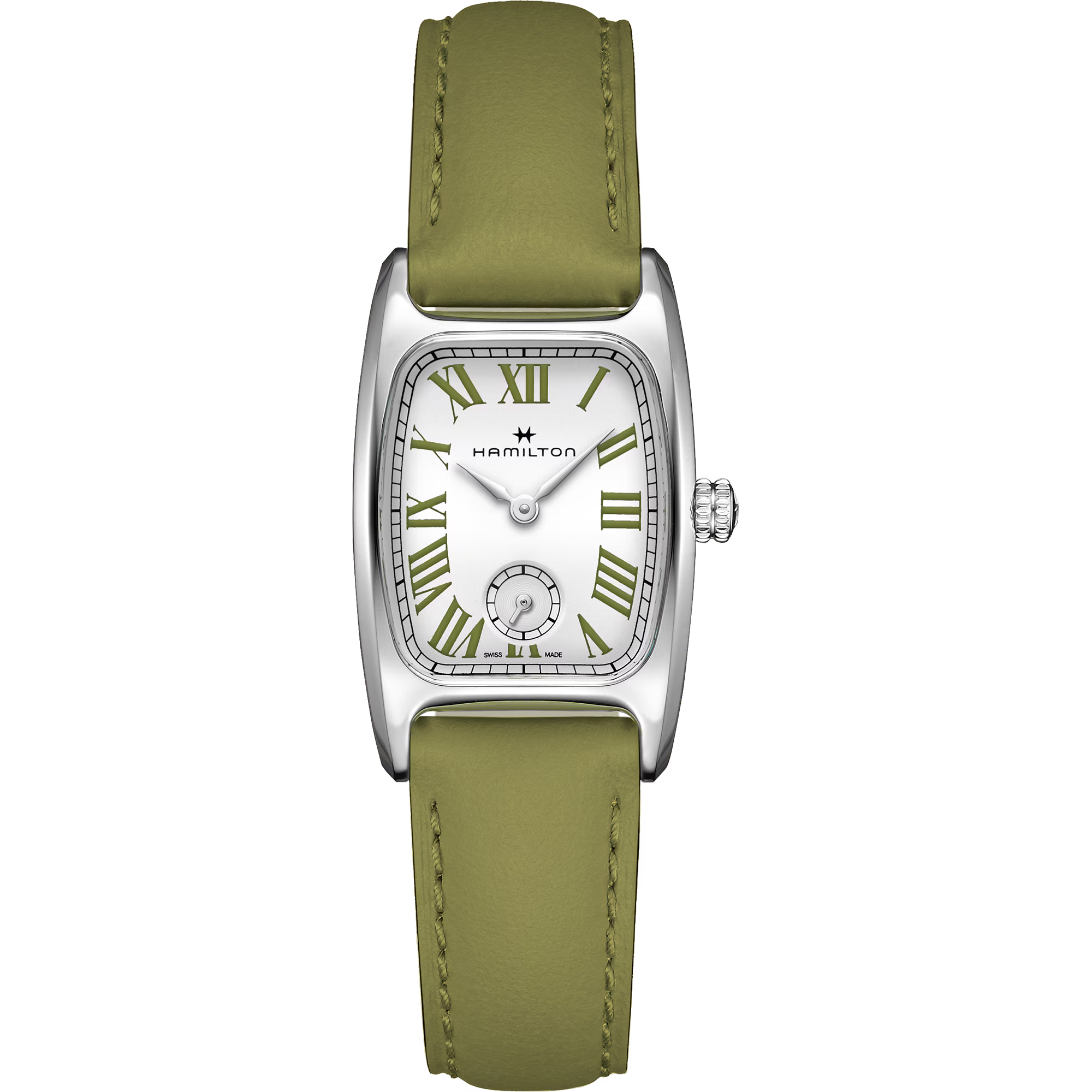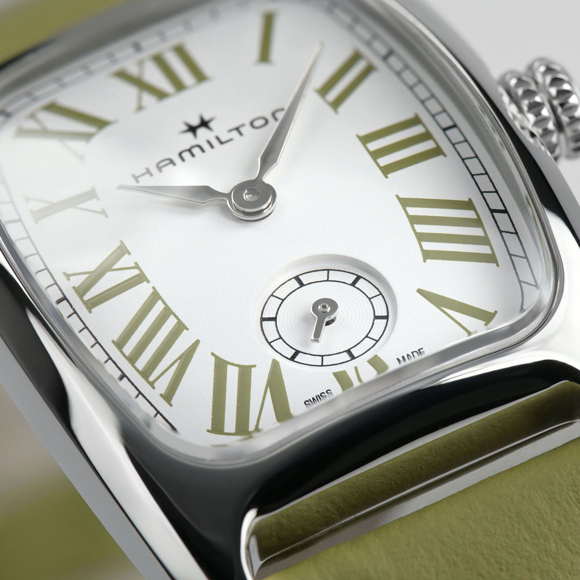 Caratterizzato da una cassa dall’elegante forma arrotondata e da un design Art Déco distintivo, l’Hamilton Boulton M è stato rivisitato con colori vivaci ispirati agli inconfondibili macaron. Il segnatempo presenta uno splendido quadrante bianco perlato impreziosito da numeri romani in verde pistacchio e da un cinturino in pelle coordinato per completare il look. Esplorando una palette di sorprendenti combinazioni di colori, l'Hamilton Boulton è un prezioso e accattivante compagno per il polso. Perfetto connubio di vecchio e nuovo, questo segnatempo irradia un fascino femminile al contempo moderno e senza tempo.