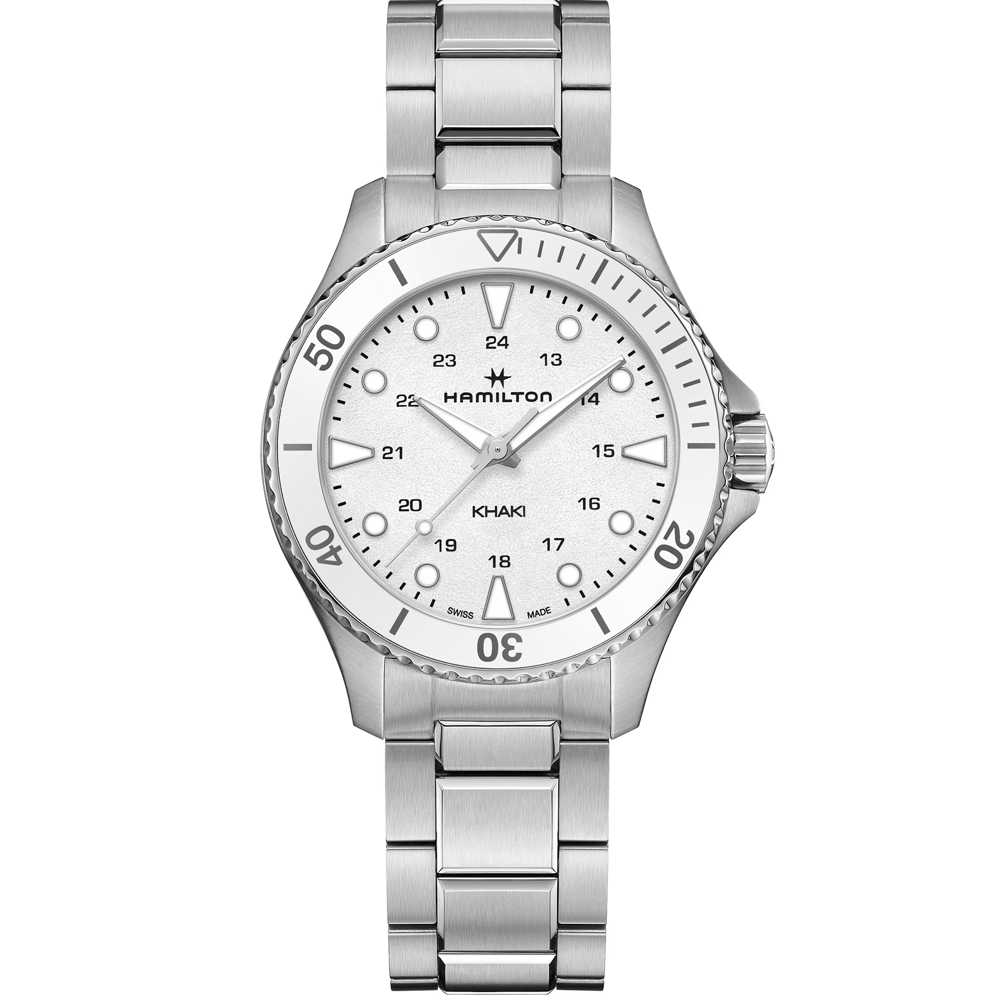 Cogli l’attimo con lo straordinario Khaki Navy Scuba Quartz total white! La lunetta in ceramica da 37 mm con numeri incisi lo rende il segnatempo subacqueo perfetto per gli esploratori marini, proteggendolo da elementi corrosivi come sabbia e sale. Abbinato ad un cinturino in caucciù bianco o ad un elegante bracciale in acciaio, il suo design raffinato ma sportivo assicura puntualità per ogni vacanza al mare o avventura subacquea.
