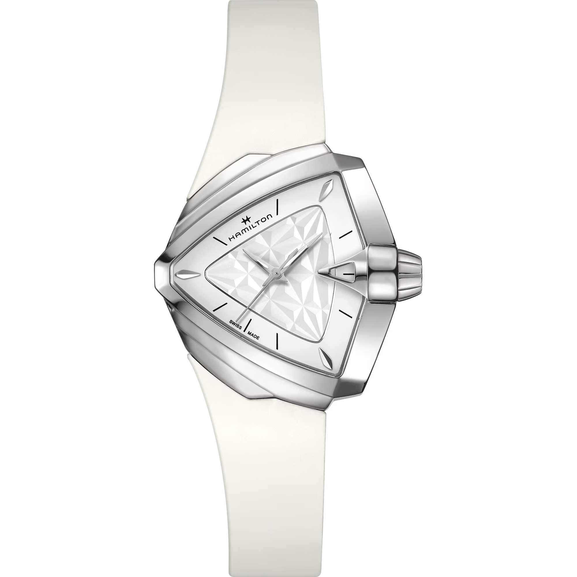 Più di cinquant’anni dopo, il primo orologio elettrico al mondo conserva un’estetica futuristica con la sua iconica cassa triangolare. Il Ventura S Quartz presenta un design ad effetto 3D su un quadrante nero o bianco completato da un cinturino in caucciù coordinato.