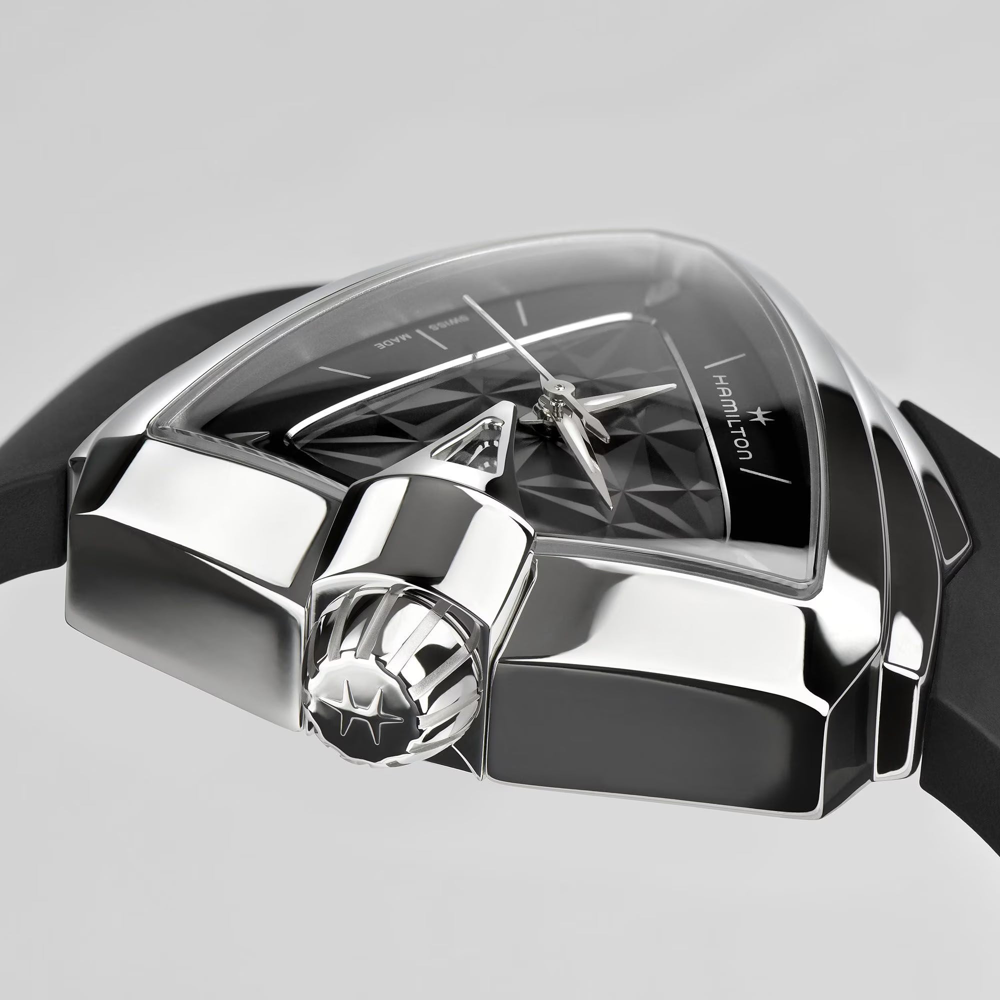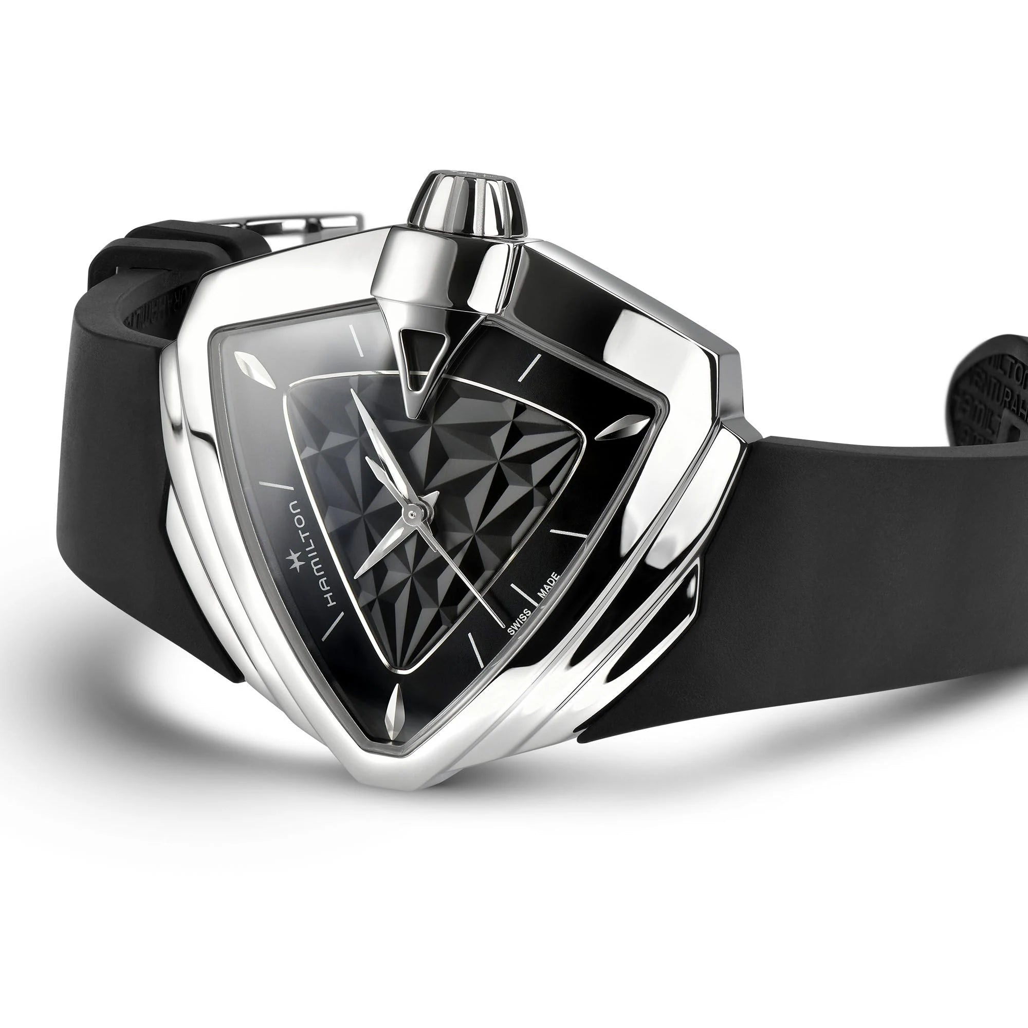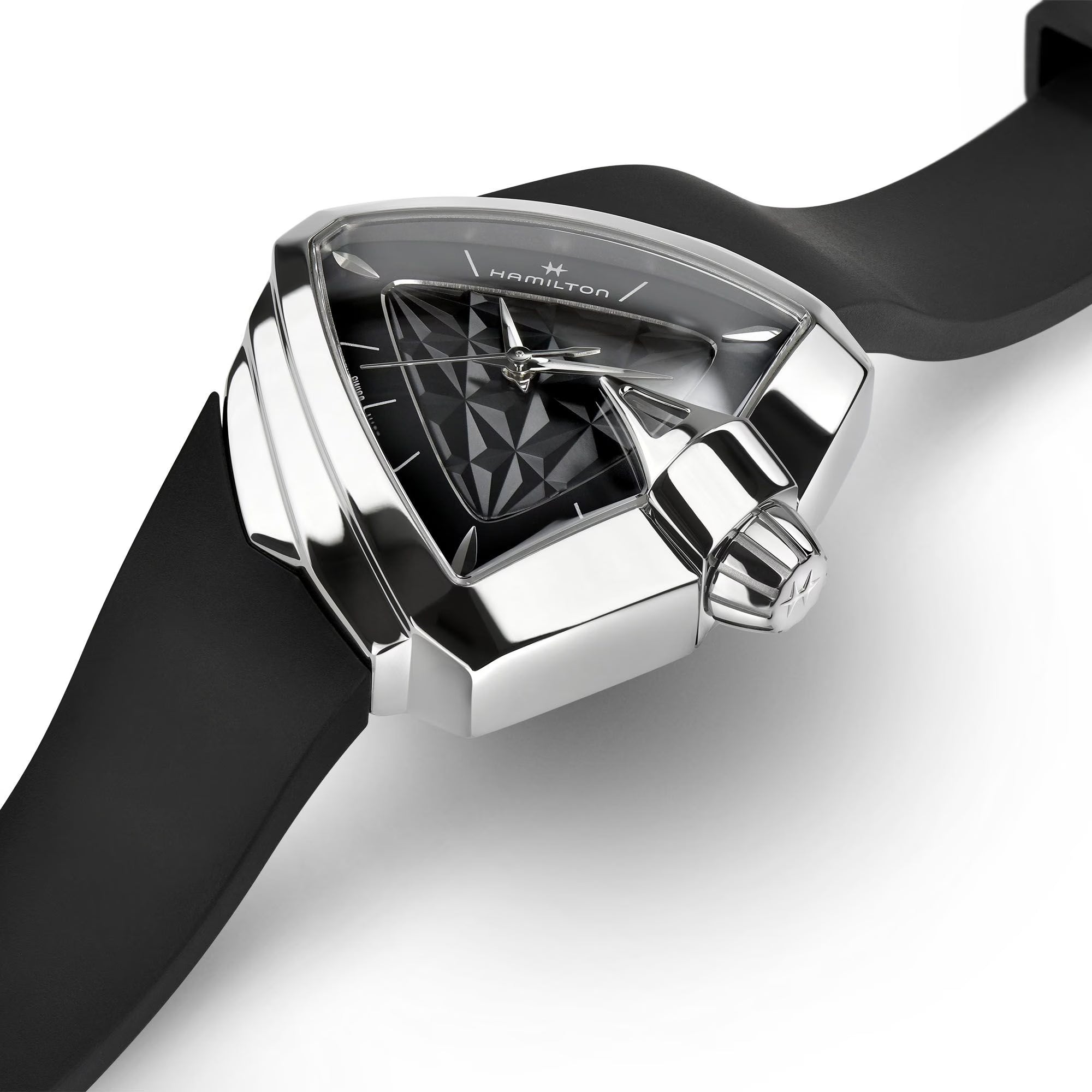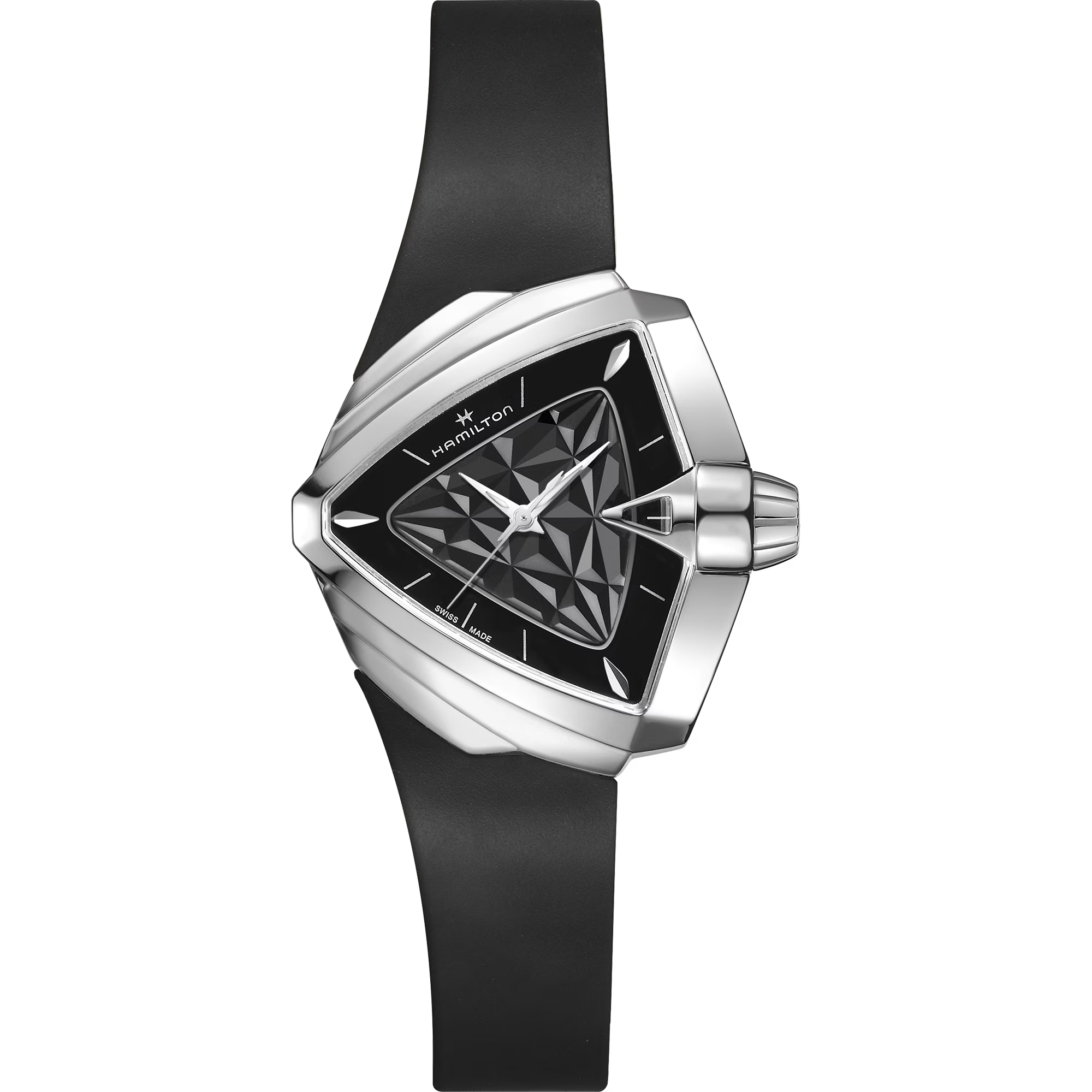 Più di cinquant’anni dopo, il primo orologio elettrico al mondo conserva un’estetica futuristica con la sua iconica cassa triangolare. Il Ventura S Quartz presenta un design ad effetto 3D su un quadrante nero o bianco completato da un cinturino in caucciù coordinato.