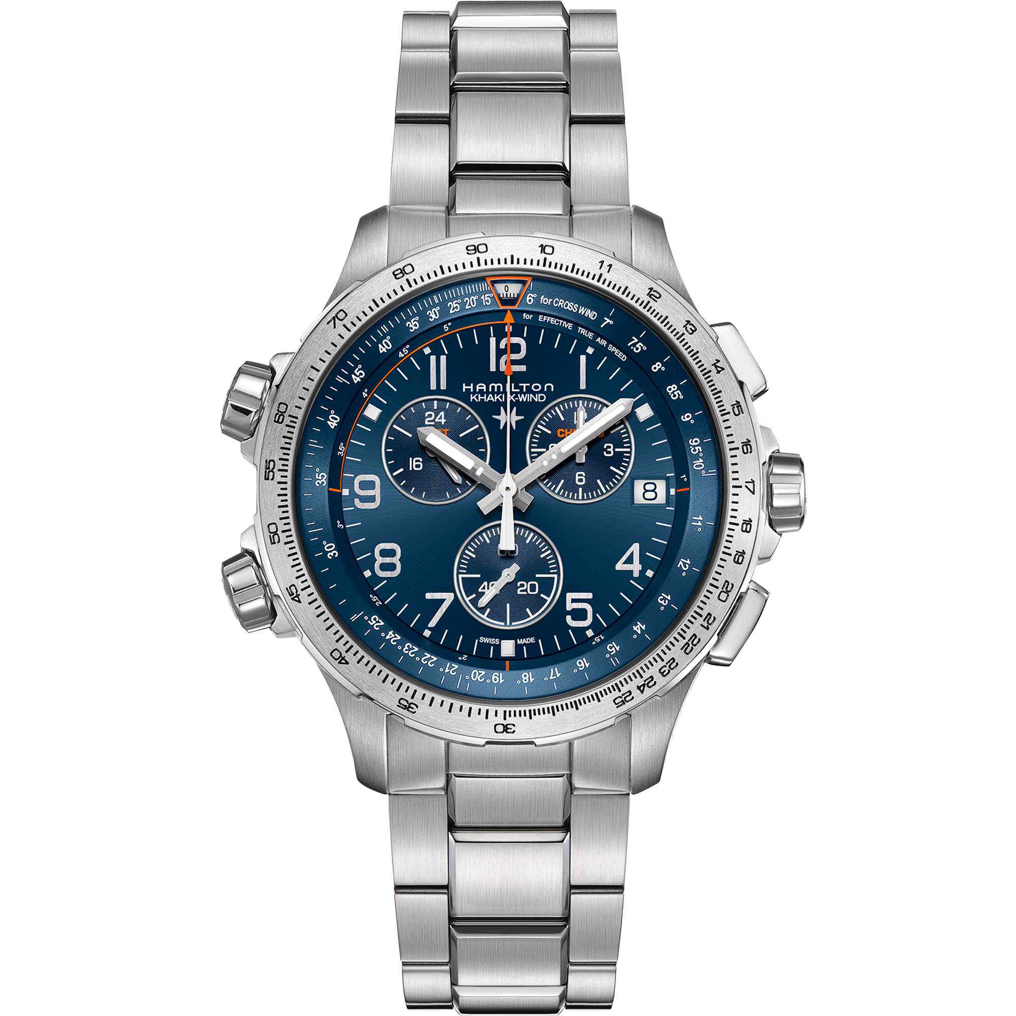Calcolatore dei venti trasversali, cronografo e ora anche secondo fuso orario: occorre un'imponente cassa in acciaio da 46 mm per contenere tutte le funzioni aeronautiche che i designer Hamilton hanno inserito nel nuovo modello della collezione Khaki X-Wind. Quando l'avventura incontra la precisione, il risultato è memorabile, che tu sia il capitano o il passeggero.