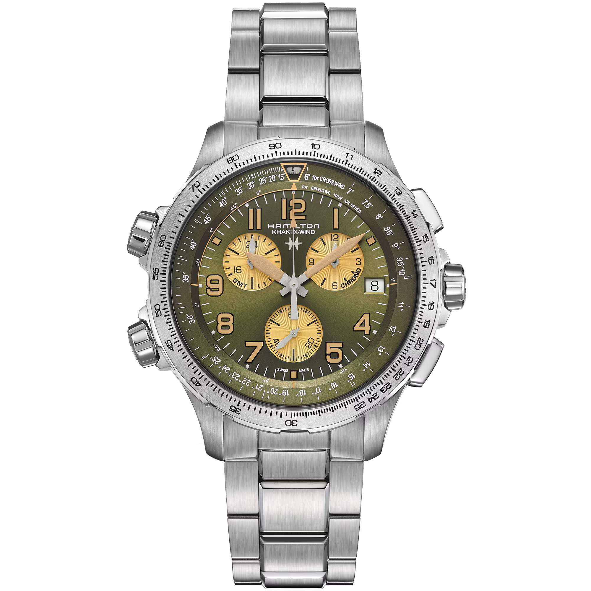 Affronta i cieli più turbolenti con questo Khaki Aviation X-Wind Chrono Quartz GMT dai forti contrasti. Con grandi numerali rivestiti in Super- LumiNova e lancette che ricordano la strumentazione aeronautica di bordo, questo orologio da pilota è pronto per qualsiasi avventura.