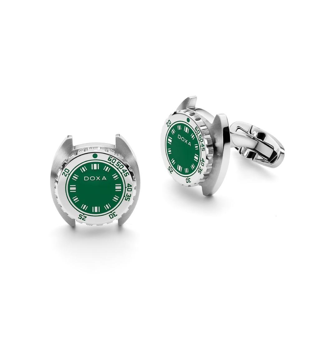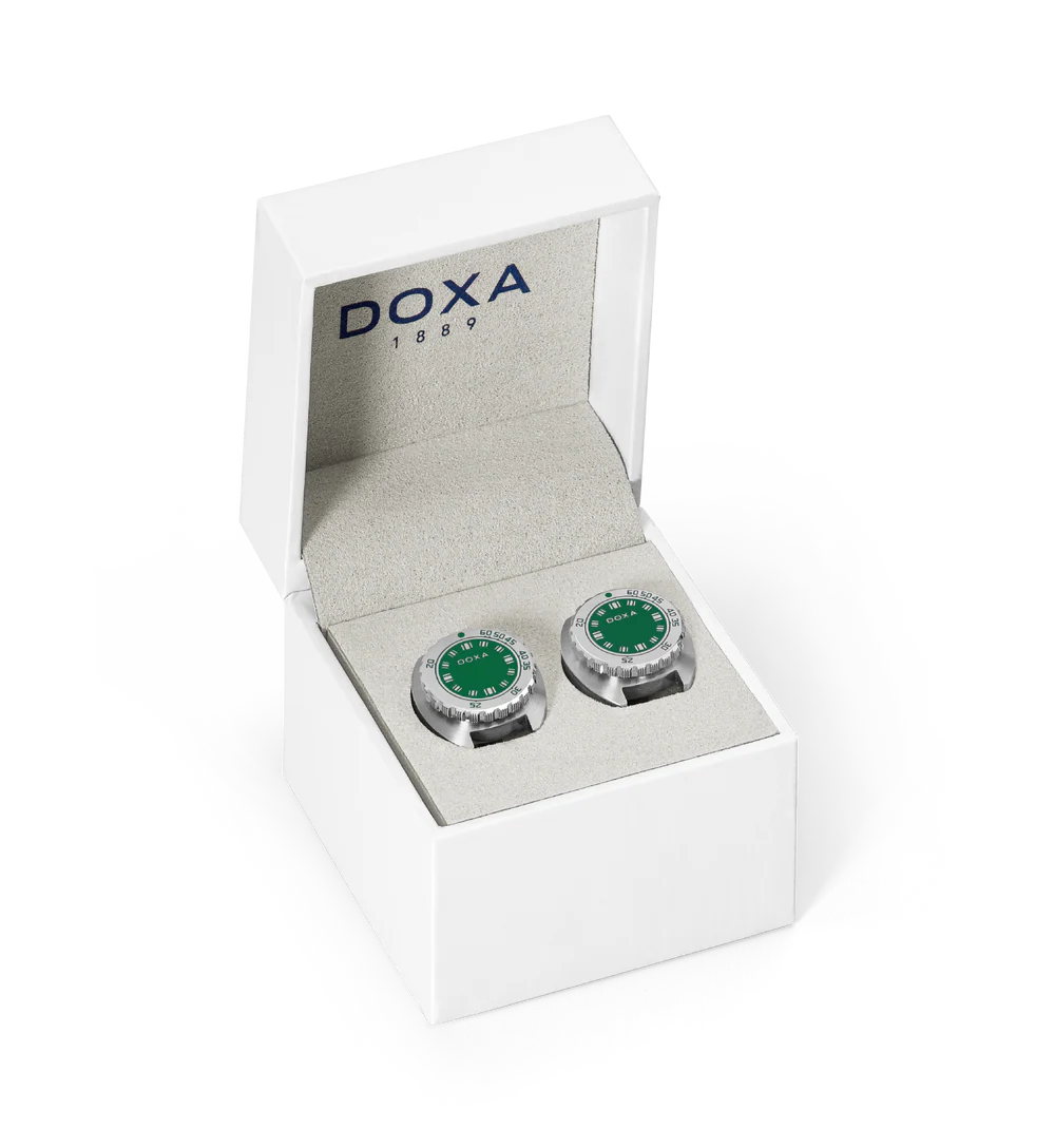 Diese neue Kreation markiert eine subtile Weiterentwicklung der Marke und verbindet uhrmacherische Präzision mit raffinierter Eleganz, die über das Handgelenk hinausreicht. Die DOXA-Manschettenknöpfe sind ein raffiniertes und entschieden modernes Accessoire, inspiriert von den ikonischen Elementen der SUB-Uhr. Ihr Design verkörpert Abenteuergeist und verleiht jedem Look einen Hauch von Stil, von der Stadt bis zum entspannten Wochenende. Ein zeitloses Detail, das nie aus der Mode kommt und dank markanter Merkmale wie der einzigartigen Form des SUB-Gehäuses, der Lünette mit Dekompressionsskala, den dezent aufgemalten Stundenmarkierungen und dem DOXA-Logo in der Mitte sofort erkennbar ist.