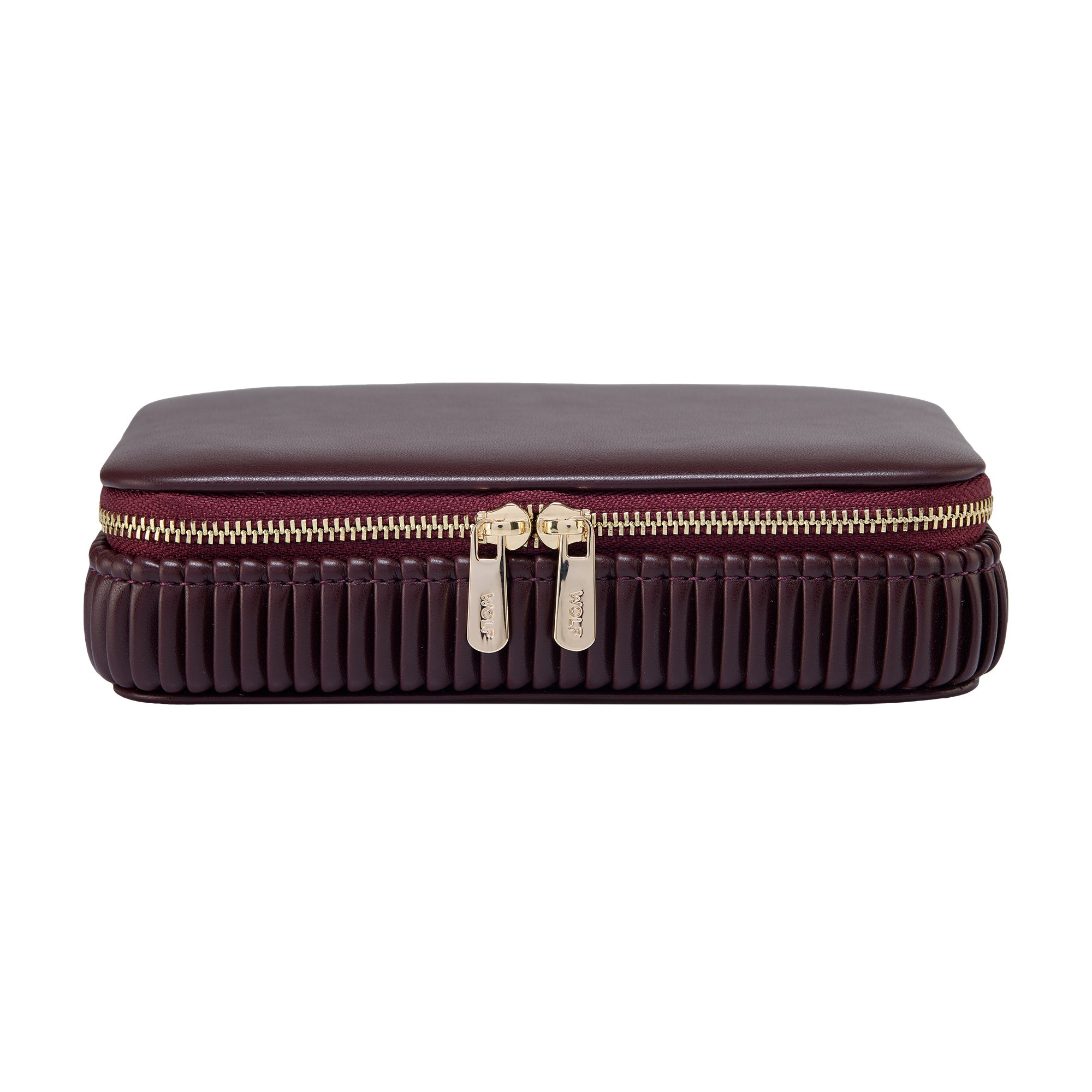 Das Bella Schmucketui mit Reißverschluss in dramatischem Burgunderrot strahlt mit seiner glatten, veganen Außenseite, den perfekt plissierten Seiten und den goldfarbenen Beschlägen Opulenz und Raffinesse aus. Im Inneren finden Sie drei mit LusterLoc™ ausgekleidete Fächer für Ihren Schmuck, zwei Rollen für Ringe oder Ohrringe und im Deckel zwei zusätzliche elastische Taschen zur Aufbewahrung. Einfach wunderschön.