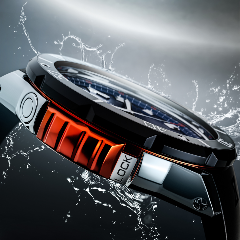 Caratteristiche: Corona e/o pulsanti Edox con doppio O-ring, valvola dell’elio, lancette e/o indici luminescenti, lunetta girevole in ceramica, corona e/o pulsanti a vite, blocco lunetta