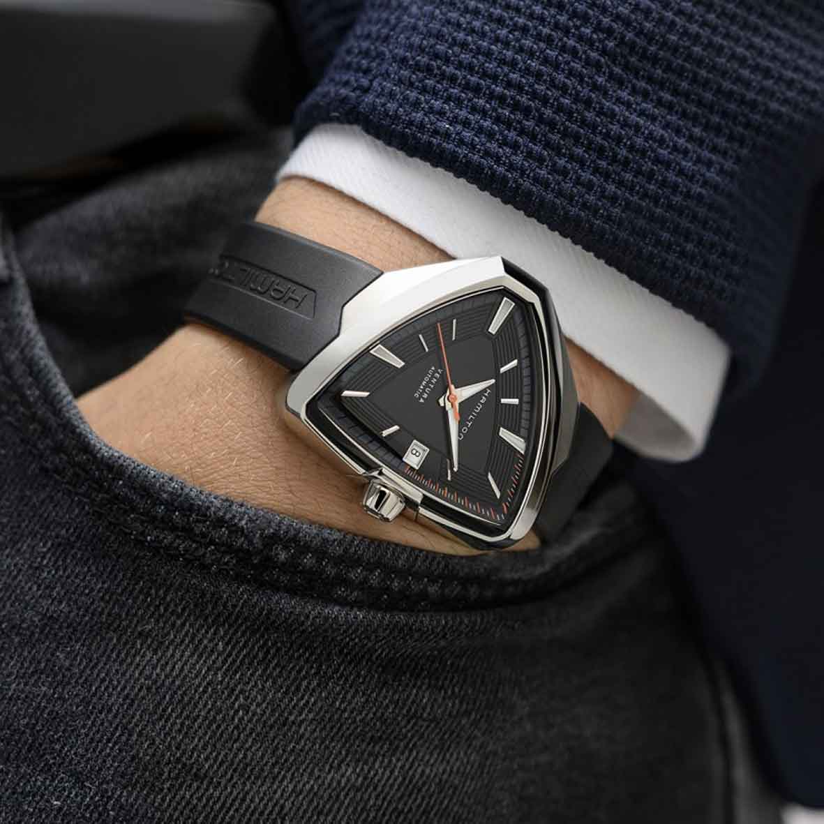 The original Ventura, introduced in 1957, made watchmaking history as the world's first battery-powered electric watch. The new version is a tribute to a revolutionary artist and avid Ventura fan: Elvis Presley . The H-10 movement has an 80-hour power reserve, a tribute to the 80th anniversary of Elvis's birth.