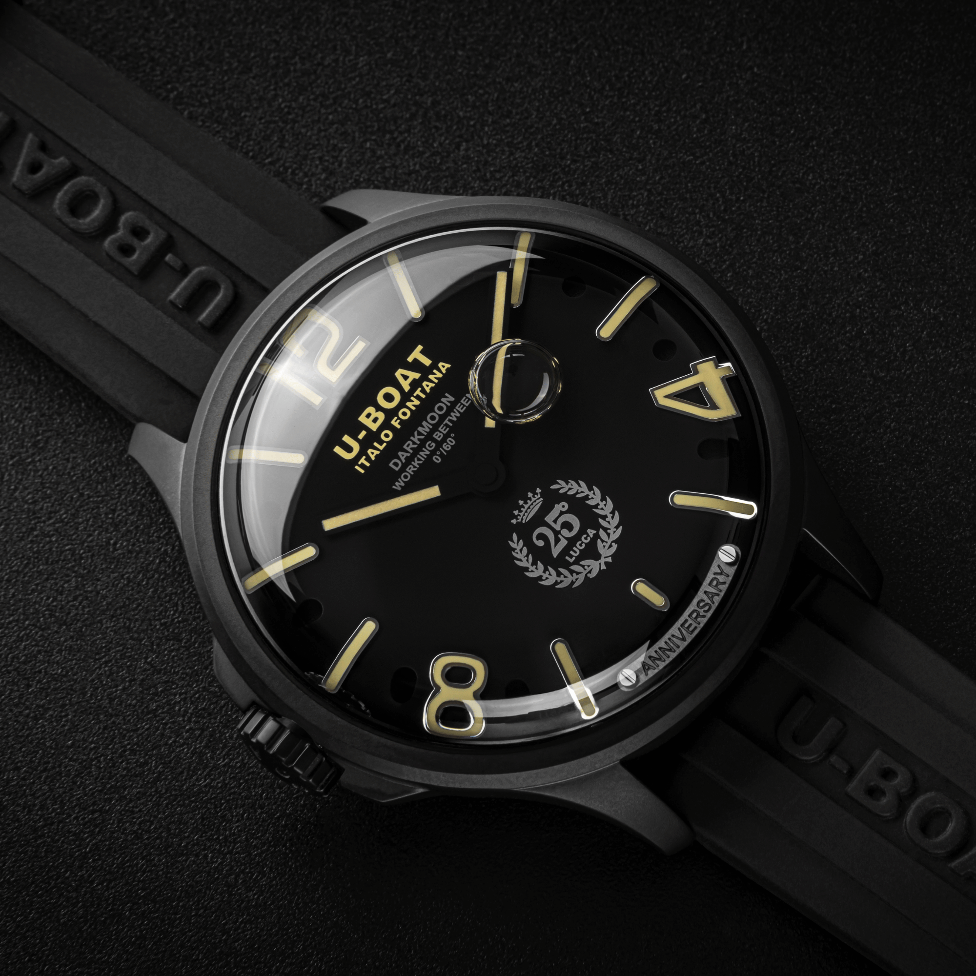 Black lacquered metal. Applied indexes and numerals, black lacquered metal hands treated with beige Superluminova. "Anniversary" plaque at 6 o'clock. 25th anniversary U-BOAT logo.