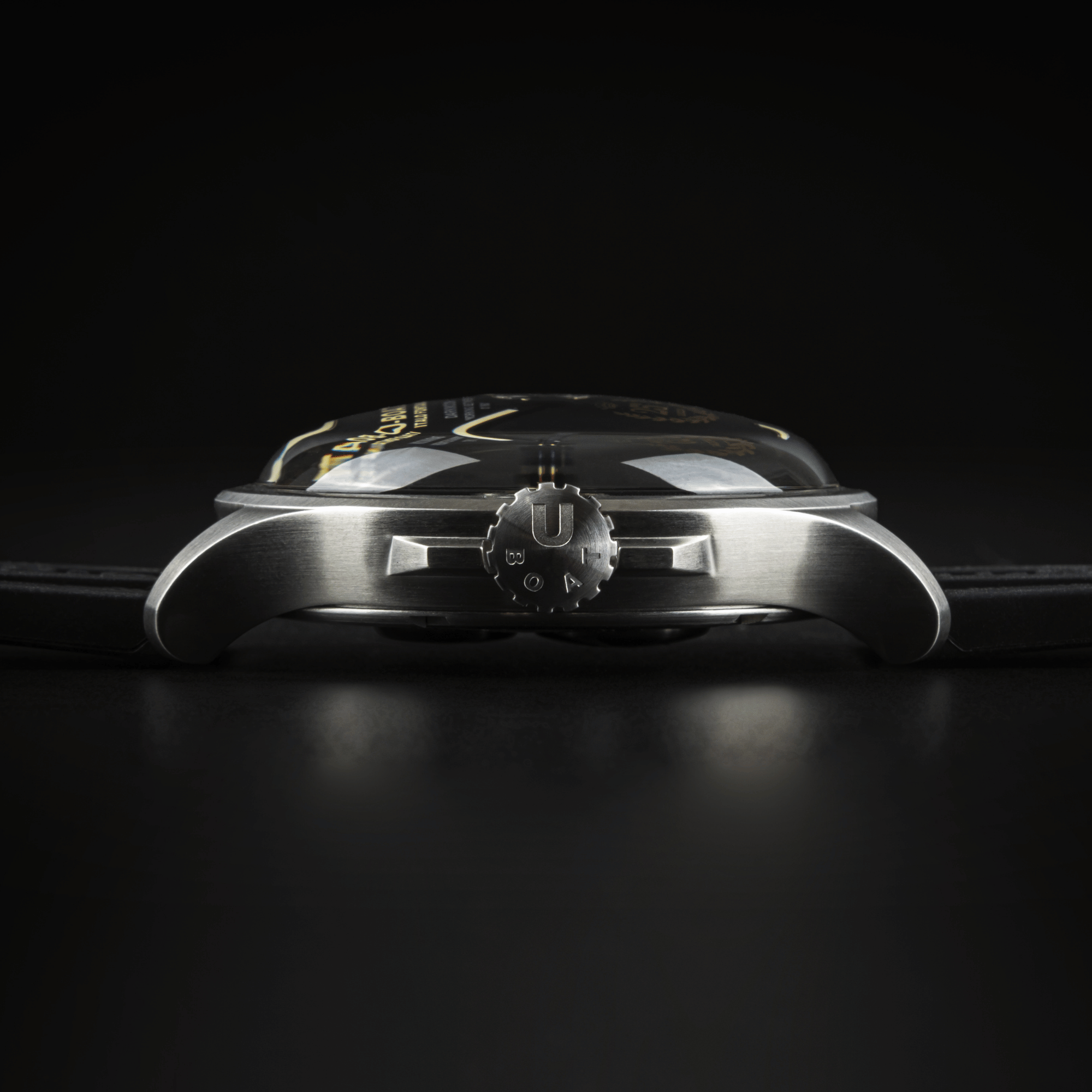 Made of AISI 316L steel. Completely filled with a special oil that highlights the dial, creating the illusion of a glass-free case, resulting in a more intense color and improved readability. Visible air bubble on the dial compensates for temperature variations. Distinctive crown protector on the left. Diameter: 46.50 mm.
