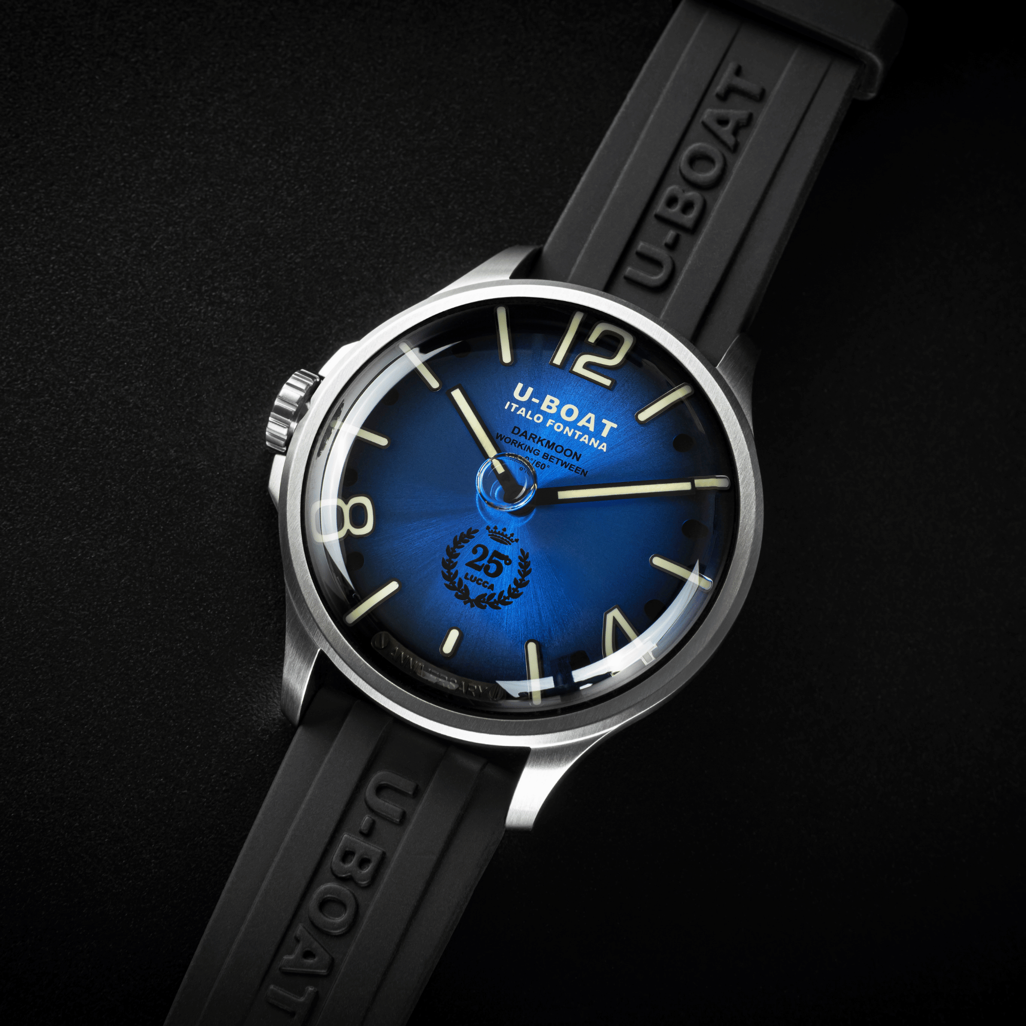 Blue lacquered metal. Applied indexes and numerals, black lacquered metal hands treated with beige Superluminova. "Anniversary" plaque at 6 o'clock. 25th anniversary U-BOAT logo.