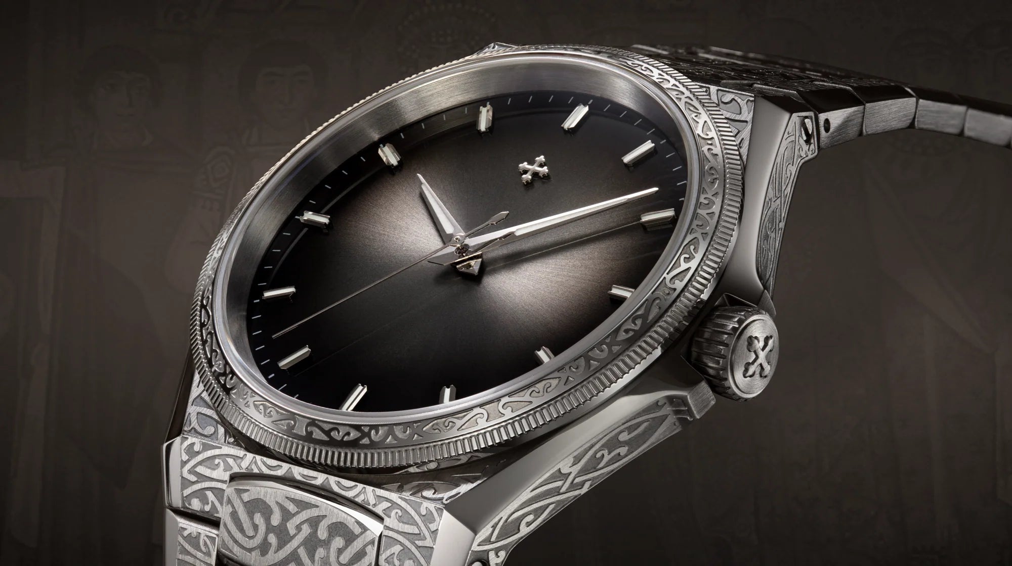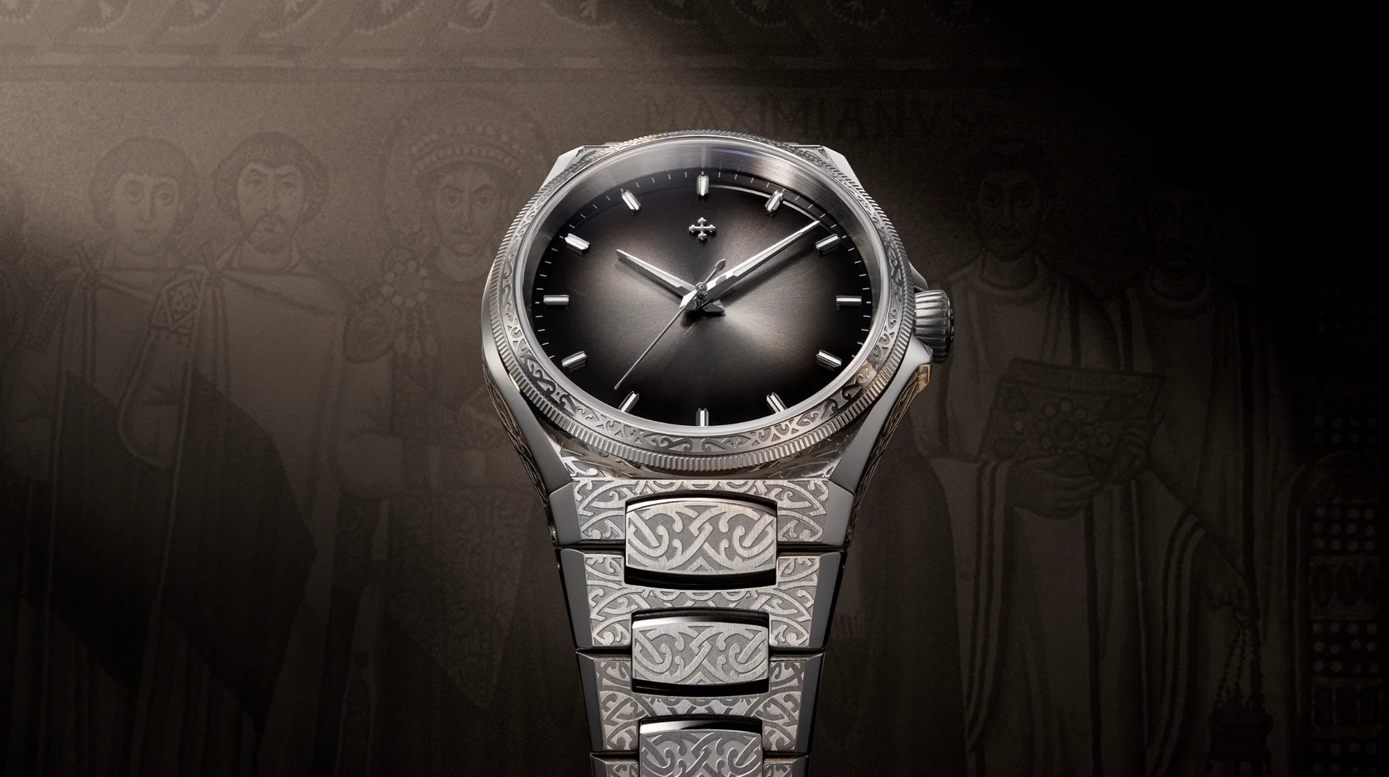 Arsenale Bizantino is born from the encounter between the decorative richness of Constantinople's art and the essentiality of our design. The engravings, inspired by the geometric motifs that once adorned mosaics and architecture, interact with the depth of the anthracite dial, crafted with a sunburst enamel finish and smoky nuance, creating a refined and harmonious contrast. A timepiece that celebrates complexity as an expression of balance, reinterpreting with modern rigor the aesthetic legacy of an empire that united East and West.