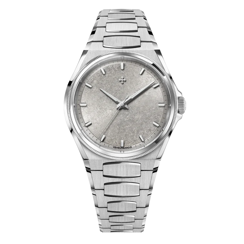 Arsenale Platino combines clean lines and the strength of an incorruptible metal. The dial, finished with controlled tumbling and platinum plating, features a vibrant texture that's different for each piece. The 40 mm, 9.95 mm thick steel case is distinguished by its polished fluted bezel and brushed surfaces. Inside, the Swiss Made V3250 automatic caliber (based on a Soprod M100) ensures precision and reliability with 28,800 vibrations per hour.