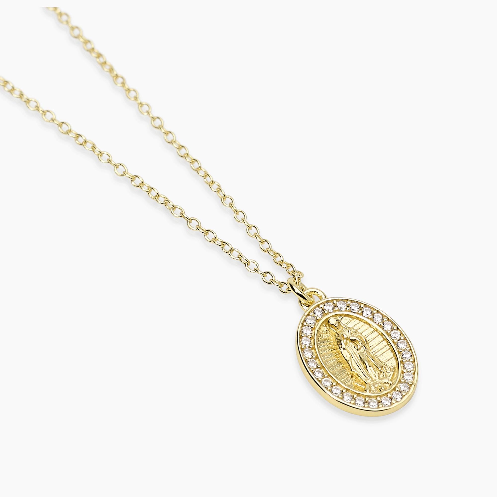 Gargantilla ajustable en plata rodiada bañada en oro de 18K con cadena roló y colgante ovalado con la Virgen y circonitas blancas.