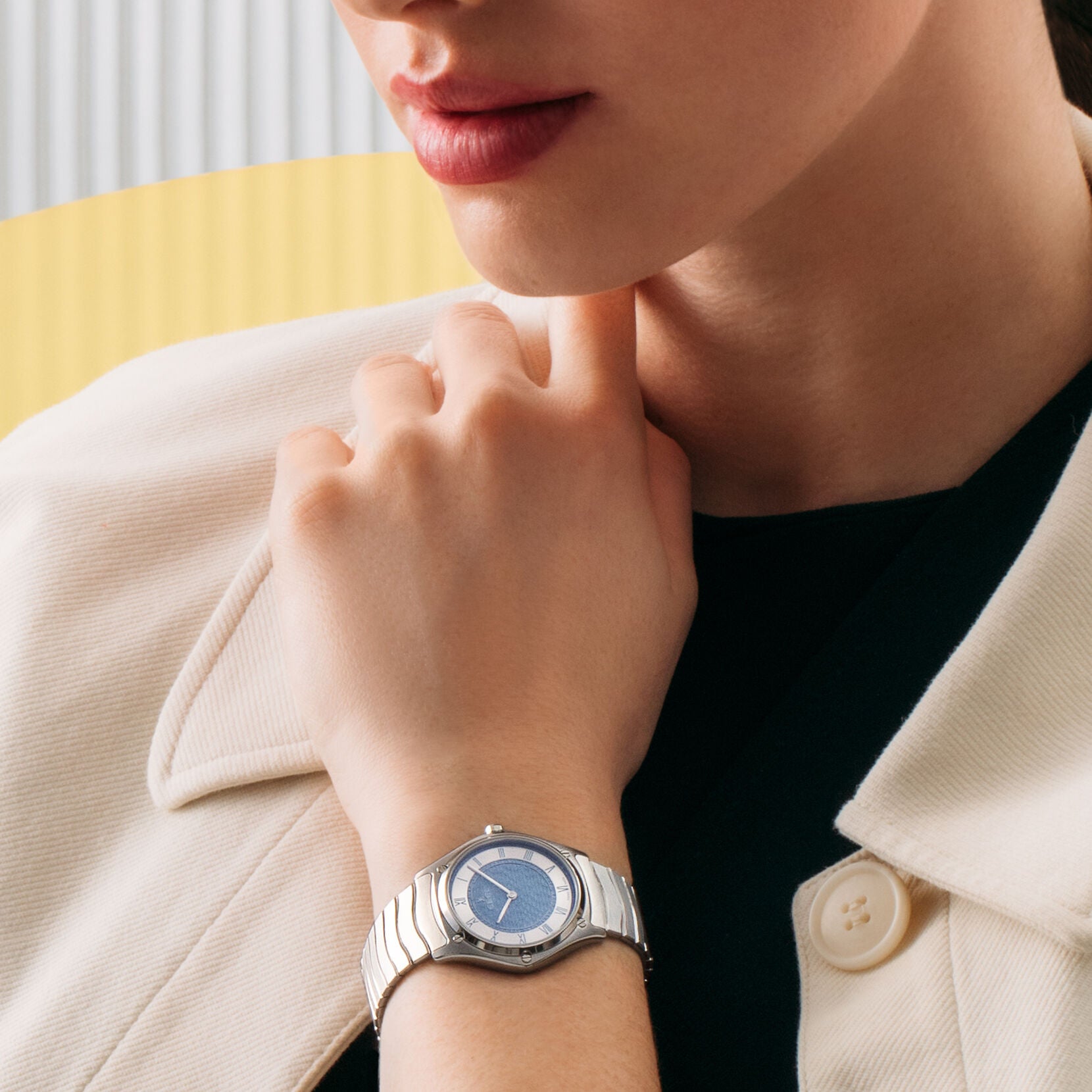 Orologio da donna EBEL Sport Classic, cassa in acciaio inossidabile, Ø 33 mm, quadrante azzurro e argento con numeri romani incisi e dipinti in blu, motivo a onde, vetro zaffiro con trattamento antiriflesso sottostante, bracciale in acciaio inossidabile con maglie a onde e chiusura pieghevole, movimento al quarzo svizzero, impermeabile fino a 5 bar