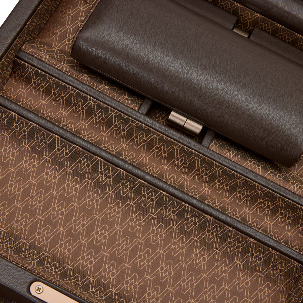 Earth Watch Stand Box con coperchio in vetro e un cassetto singolo, ha un esterno in pelle di mela con hardware metallico opaco e serratura con chiave. All'interno, un rivestimento in jacquard satinato riciclato con il motivo WOLF Signature presenta un supporto per orologi retrattile per due orologi e numerosi scomparti per orologi e oggetti di valore. Il cassetto singolo ha spazio per gioielli e gemelli con due sezioni per cinturini di orologi.