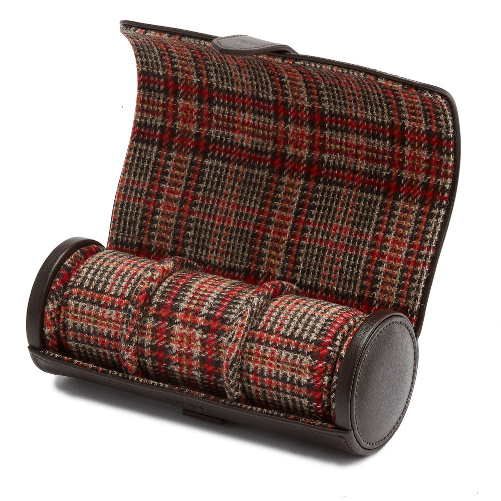 Il WM Brown Watch Roll con Cigar Case è realizzato a mano in classica pelle marrone liscia e fodera in tweed Negroni. I Watch Guards brevettati proteggono i tuoi orologi durante i viaggi.