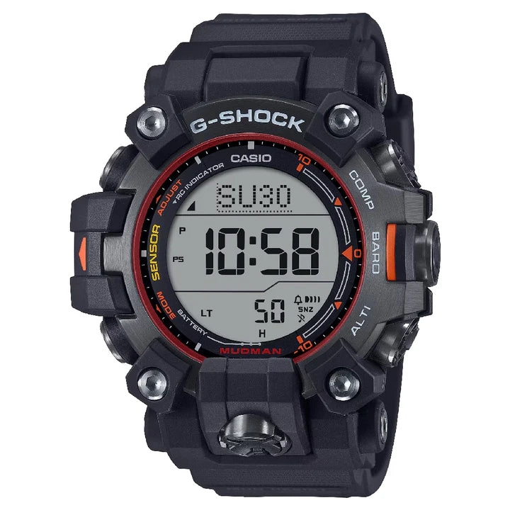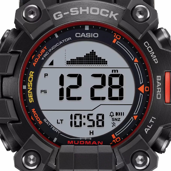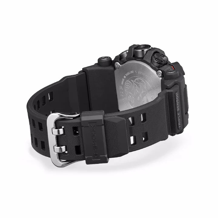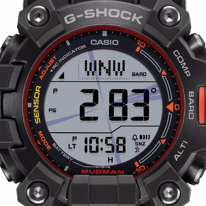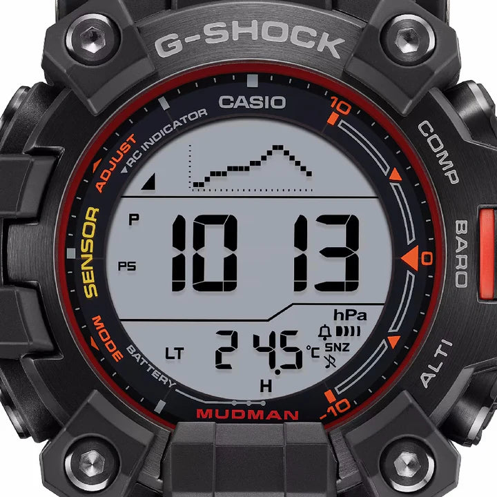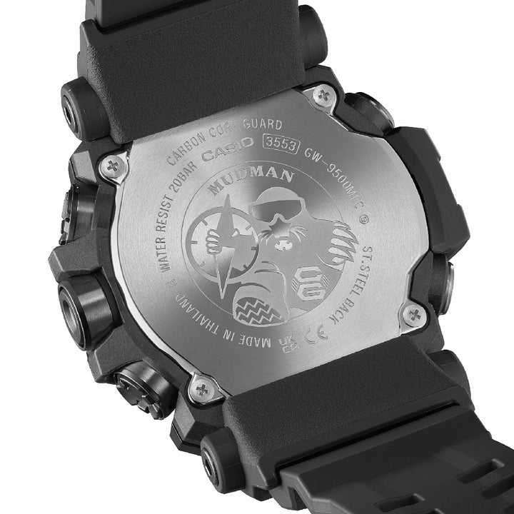 Il modello MUDMAN GW-9500MEC non solo è dotato di una struttura resistente a polvere, fango e urti, ma offre anche funzionalità radiocomandate e alimentate a energia solare. Il display a bussola digitale con una migliore leggibilità utilizza un LCD duplex per una maggiore praticità. L'acciaio inossidabile per i componenti della lunetta e la placcatura agli ioni neri completano il look intrepido dell'orologio.