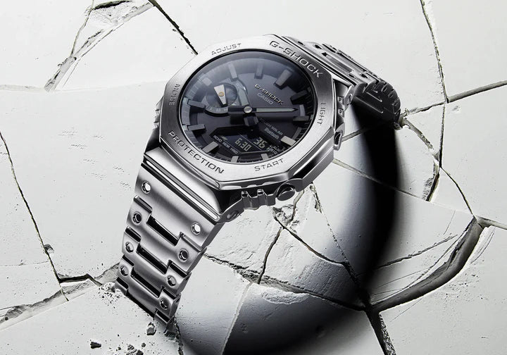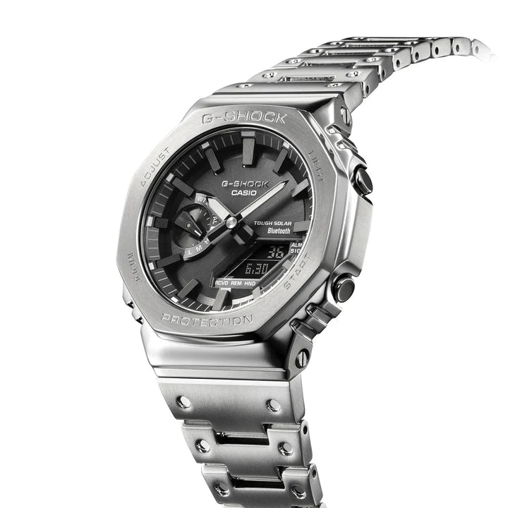 La serie G-SHOCK 2100, in continua evoluzione, presenta il suo primo modello full metal, che incarna l'identità del primo G-SHOCK DW-5000C come nessun altro. Design raffinato e minimal con iconica cassa ottagonale, lunetta e bracciale in acciaio inox, ma sempre indistruttibile grazie alla struttura antiurto che ne protegge il modulo, marchio di fabbrica di G-SHOCK. Un orologio di alta qualità, che seppur con cassa e profilo slim, garantisce un'ottima vestibilità al polso e offre un'ampia gamma di funzioni tecnologiche.Come Connected Watch, l'orologio si collega facilmente con lo smartphone tramite Bluetooth®. È sufficiente collegarsi all'app dedicata per ottenere un cronometraggio preciso o per utilizzare altre funzioni. La collezione GM-B2100 è dotata della tecnologia ecologica Tough Solar, che alimenta tutte le funzioni, come l'illuminazione a LED, l'allarme o il timer per il conto alla rovescia. Questa collezione è l'espressione di un design moderno, ma raffinato, materiali di alta qualità, tecnologie avanzate e semplicità di utilizzo.