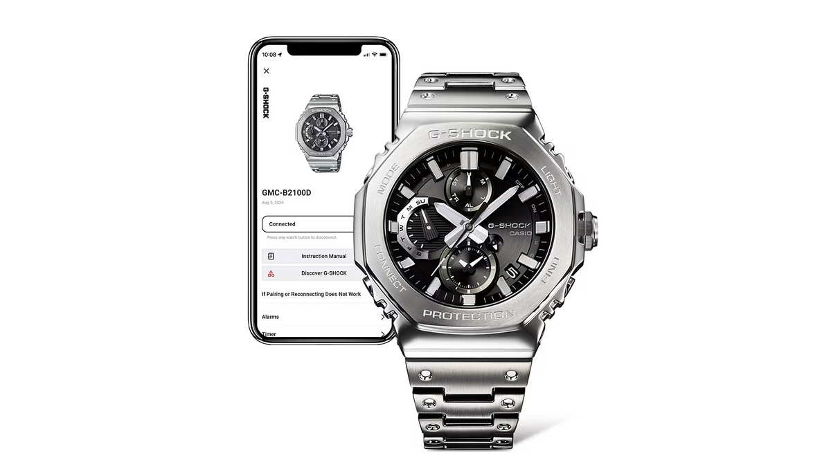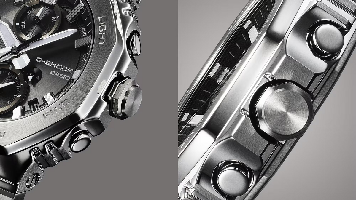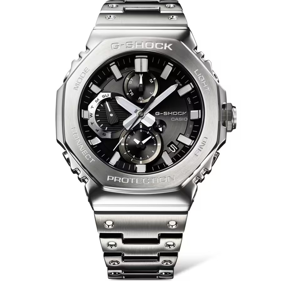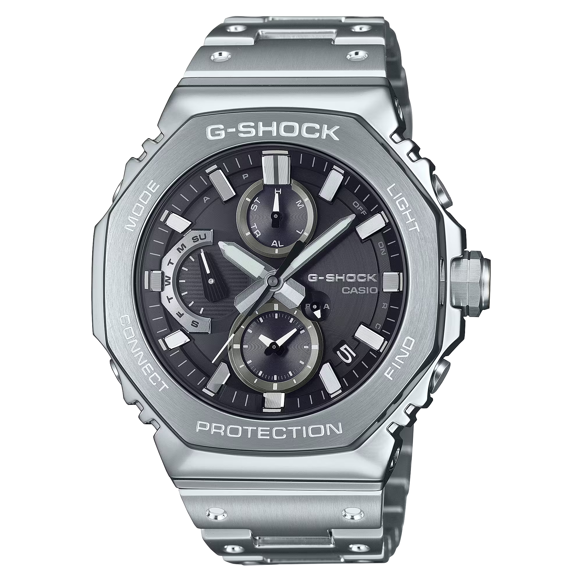 Il primo cronografo G-SHOCK, GMC-B2100D-1A, completamente in acciaio e con cassa ottagonale. Nuovo arrivato nella linea di orologi 2100 in continua evoluzione. Tra la lunetta e la cassa, sono installati componenti di stabilizzazione in resina fine per ottenere una struttura resistente agli urti con una superficie esterna completamente in metallo. La lunetta, la cui forma tridimensionale è frutto di un lungo processo di forgiatura, taglio e lucidatura, è rifinita con un trattamento circolare a linea sottile sulla superficie superiore e una lucidatura a specchio sui lati inclinati.