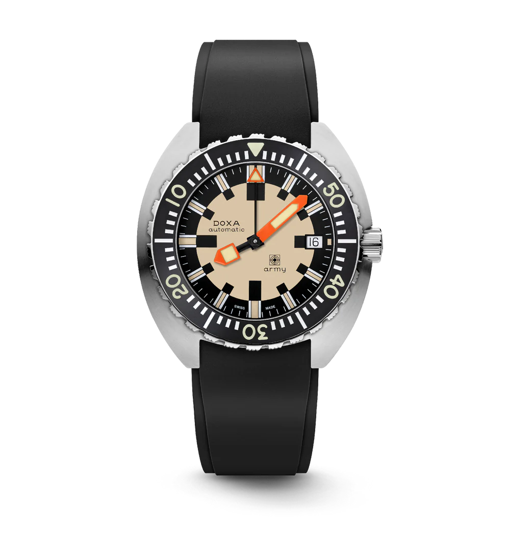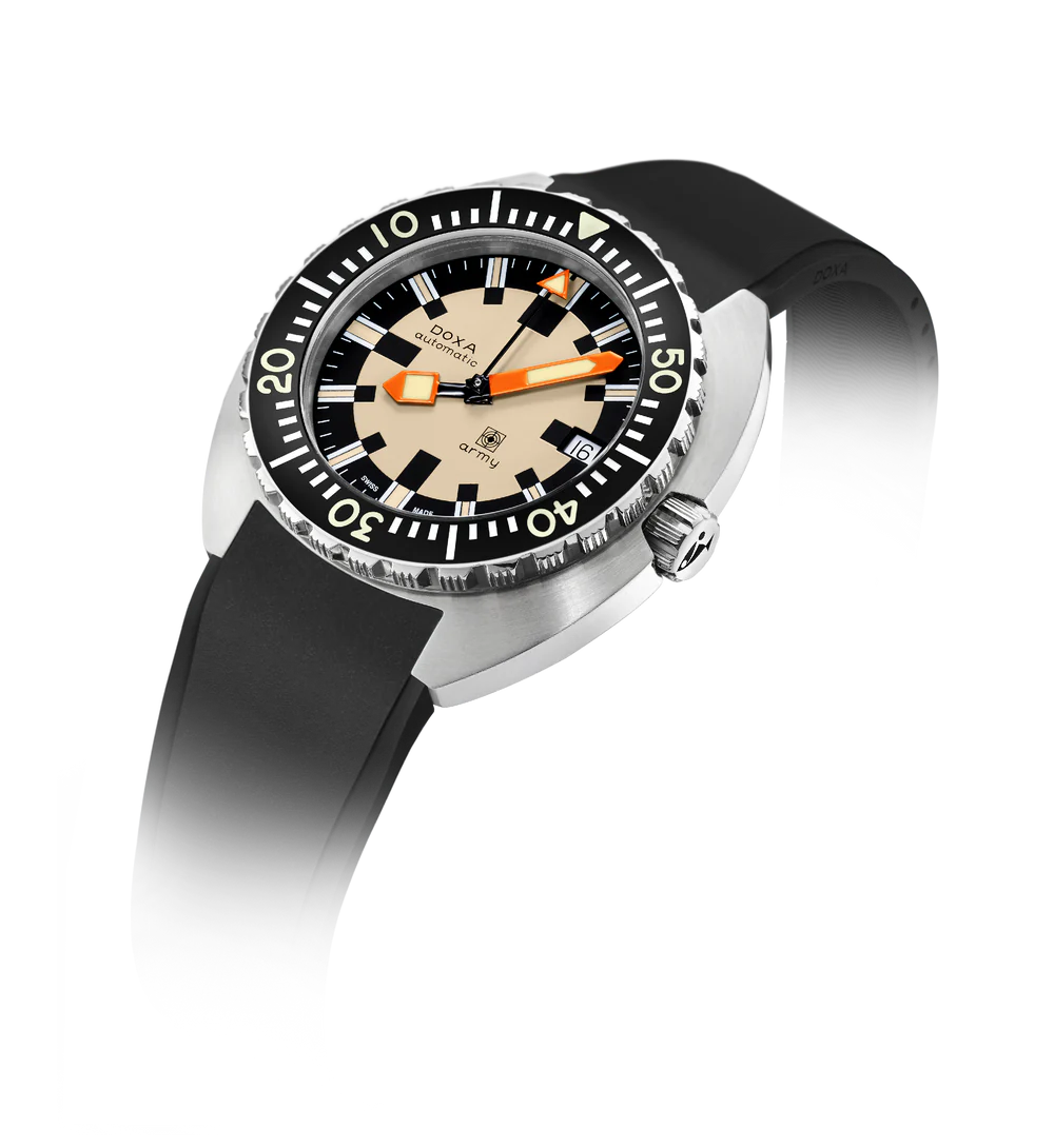 Il DOXA Army riprende fedelmente l’estetica del modello originale, aggiungendo un tocco sottile di modernità e prestazioni in linea con i tempi di oggi.