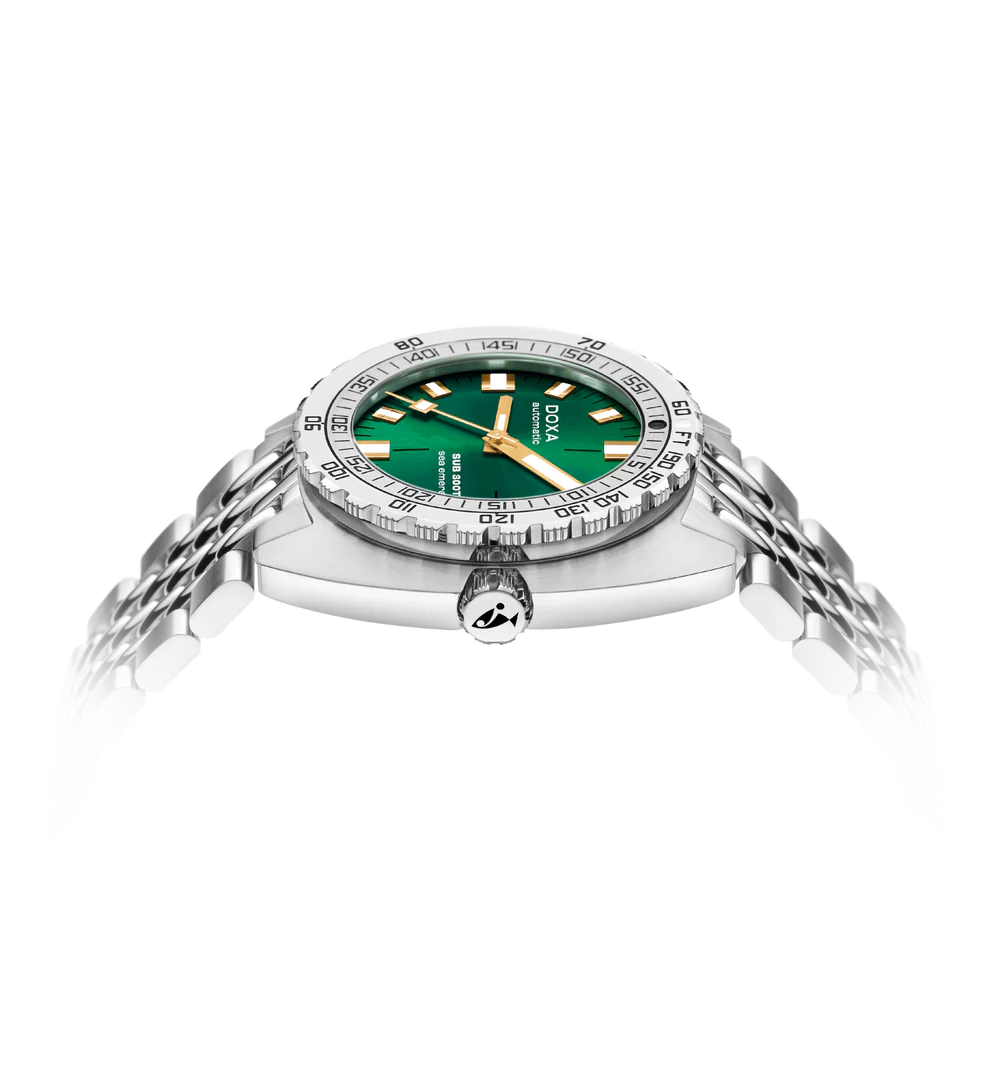 Il bracciale, anch’esso in acciaio inossidabile 316L, presenta una chiusura pieghevole con il simbolo del pesce DOXA.