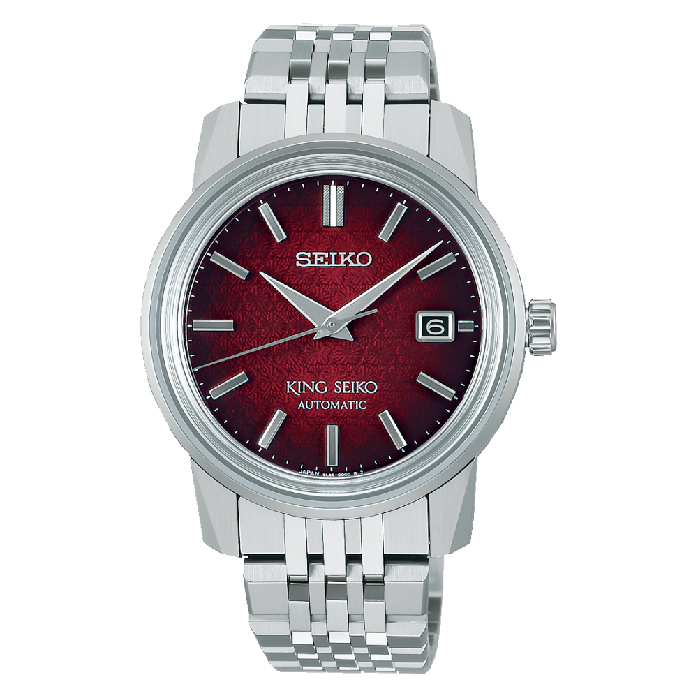 L'orologio KING SEIKO SJE103J1 combina un quadrante piatto con indici sfaccettati e lancette “Diamond Cut” per riprendere con precisione le caratteristiche essenziali del modello originale degli anni '60. Il suo nuovo design, più sottile, riprende il design originale del KSK, tagliente e spigoloso, con anse larghe e finiture abbaglianti. Questo modello è dotato del calibro top di gamma 6L35. Il colore e il motivo del quadrante rosso prugna “Garyu-bai” si ispirano al luogo di nascita del primo King Seiko a Kameido, Tokyo, famosa per i suoi frutteti di prugne. Il “Garyu-bai” era l'albero di prugne più popolare, chiamato così per la sua forma, che ricorda un drago sdraiato a terra. Questo albero ha ispirato uno degli ultimi capolavori dell'artista Ukiyoe Utagawa Hiroshige: “Giardino di prugne a Kameido”, poi riprodotto da Van Gogh nella sua famosa “Japonaiserie”.
