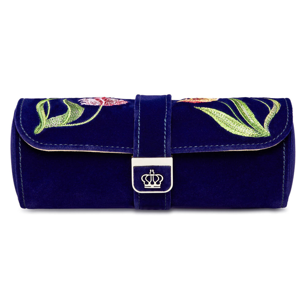 Roll per orologi doppio in velluto blu profondo con un elaborato ricamo a tulipano all'esterno, include una piccola custodia per gioielli con ricamo in velluto e spazio per 2 orologi con il Watch Guard brevettato di WOLF. Organizza i tuoi orologi e gioielli con stile. Include fodera anti-ossidazione LusterLoc™ e chiusura e dettagli in finitura argento.