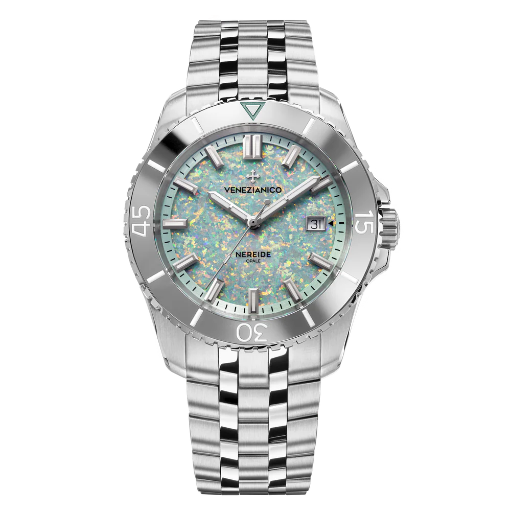 Il Nereide Opale è un orologio automatico in acciaio 316L con quadrante in opale sintetico, capace di riflettere la luce in modo unico e sempre diverso. Ogni esemplare presenta sfumature irripetibili, valorizzate da un design essenziale e monocromatico. Dotato di movimento svizzero Sellita SW200-1 a vista e prodotto in Edizione Limitata di 500 pezzi numerati, unisce materiali rari, meccanica di precisione e design contemporaneo.